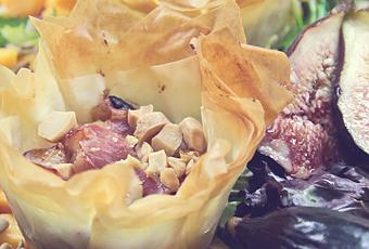Ya hay higos!!! Aix, cómo me gustan!! La dietista me las tiene totalmente prohibidas, pero voy a la frutería y me compro 3 o 4. Me las como de pié, en la cocina, antes de ordenar la compra. Así, a lo ansias. El otro día me crucé con unas cuantas fotos de recetas con higos, y pensé, claro, es que nunca me da tiempo de hacer nada con ellas. Mi mente perversa empezó ha darle vueltas al asunto. Primero pensé en una tarta de higos, pero al final me decanté por una receta salada. La idea era hacer algo parecido a la Baklava pero en salado. Este es el resultado...