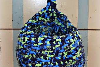 Éstos son los últimos cestos de trapillo para colgar que he hecho, para vender.Se venden por 12€ en Tralaralarita, Gros.