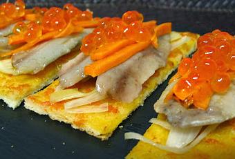 Cortamos la base a tiras. Ponemos un poco de cebolla encima., luego un boquerón y sobre el mismo, la carlota y las huevas de salmón. ¡Listo para devorar!Eso si, acompañándolo con una cerveza artesana de Xàtiva LA SOCARRADALos patrocinadores del IV Concurso Internacional de Cocina de Apicius son: