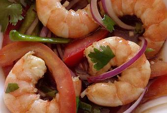4 langostinos XXL, medio tomate maduro, un cuarto de cebolla morada, medio pimiento verde, ½ diente de ajo, 1 limón (lo más verde posible), una cucharada pequeña de tabasco, una cucharada sopera de vodka, una cucharada pequeña de salsa de soja, una cucharada pequeña de aceite de sésamo, una cucharada pequeña de almibar (usé de una lata de piña en conserva), una cucharada pequeña de salsa Perrins, una ramita de cilantro fresco y sal.
