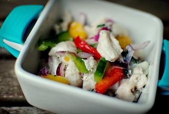 Ingredientes:1 Kg. filetes de perca sin piel ni espinas.2 cebollas rojas.1/4 pimiento rojo.1/4 de pimiento verde.1/4 de pimiento amarillo.10 limas o limones.