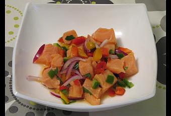 Hoy hemos versionado esta receta típica de Perú, que normalmente se hace con pescado blanco (lenguado, mero, merluza...), adaptando algunos ingredientes a los que solemos tener en casa.