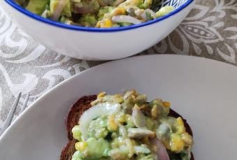 Echar en un bote de cristal aceite de oliva, cebolla, sal, un toque de pimienta, el zumo de una lima y el aguacate cortado a taquitos.