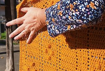 Tengo un vestido que suelo usar mucho, es de punto, muy cómodo... es azul y tiene unas pequeñas florecitas mostaza, pues esa flor me llevó a elegir ese color para mi chaleco.