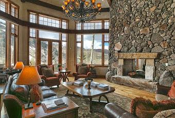 El importante y lujoso chalet esta construido en madera y piedra con gruesos maderos de techo y pisos tambien de maderas naturales rusticas