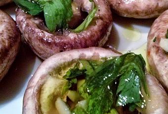 Lava los bien los champiñones para quitar cualquier resto de tierra.Quita los pies o tronco y ponlos a escurrir. Pon la plancha a calentar con fuego no demasiado fuerte.Coloca encima los champiñones boca arriba y deja que se vayan asando poco a poco . Si el fuego es demasiado fuerte se quemarían por abajo antes de que se pusieran tiernos, No se les da la vuelta para que el caldo o jugo que va soltando el champiñón no se pierda ya que con su propio jugo queda delicioso.Mientras tanto en un cuenco pon aceite de oliva y el perejil y los ajos picados. Reserva.Cuando los champiñones estén tiernos, sácalos a una fuente de servir o bandeja. Pon un poco de sal en ellos y ve echando en cada uno una cucharadita del aceite con ajos y perejil reservado.