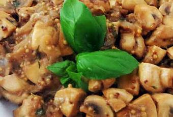 Incorpora los champiñones y cocínalos hasta que estén tiernos y comiencen a dorarse. Agrega la mostaza y la nata y mueve para que se integre todo, salpimentad y retirar del fuego inmediatamente. Decora con albahaca.