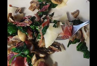 Una vez doraditos agregar los champiñones, albahaca, espinacas y los trocitos de jamón.
