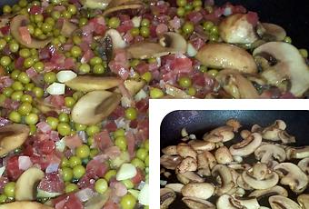 En una sartén ponemos aceite, cuando empiece a humear ponemos los ajos pelados y troceados, cuando estén dorados le añadimos los champiñones limpios y troceados en laminas, salpimentamos, una vez que los champiñones pillen el color marrón le añadimos los guisantes y el jamón a taquitos, mareamos y le ponemos un vaso pequeño de vino blanco y los dejamos cocer, aproximadamente 10 minutos.