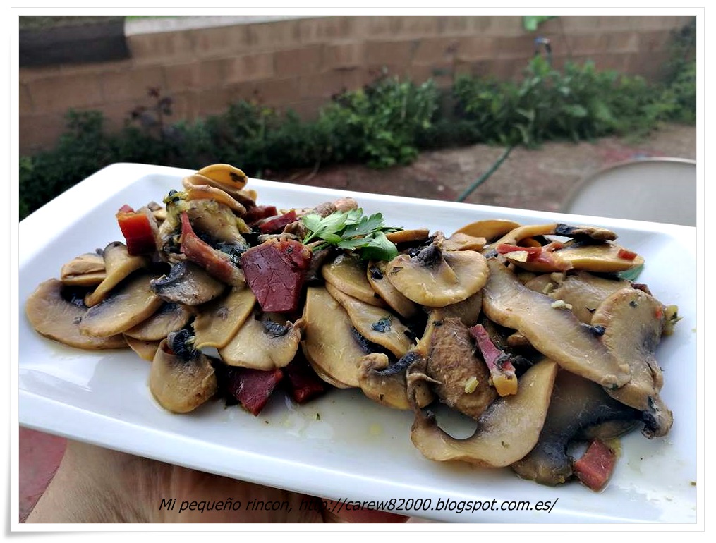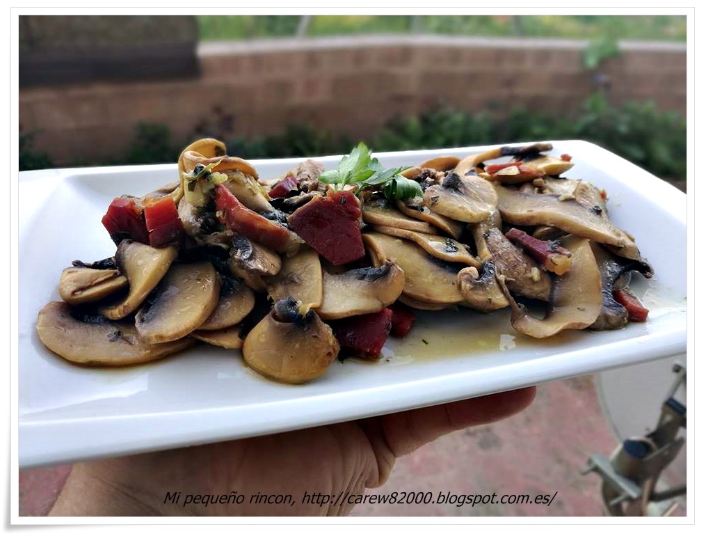 - 8 champiñones grandes- 100 gr de jamón serrano cortadito en trocitos- 3 dientes de ajo- perejil picado- aceite de oliva virgen extra- 1 copa de cerveza Cervetri y mas- sal