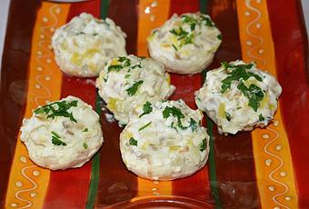 Precalentamos el horno a temperatura media (170 grados).Rellenamos los champiñones con esta mezcla y horneamos durante 20 minutos.