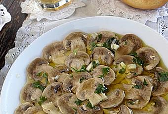Una bandeja de champiñones (200 grs más o menos)2 Dientes de ajosRamitas de perejil frescoVinagre blanco (el suficiente para cubrirlos)Aceite de oliva virgen extra ( el suficiente para cubrirlos)Sal marina, al gusto