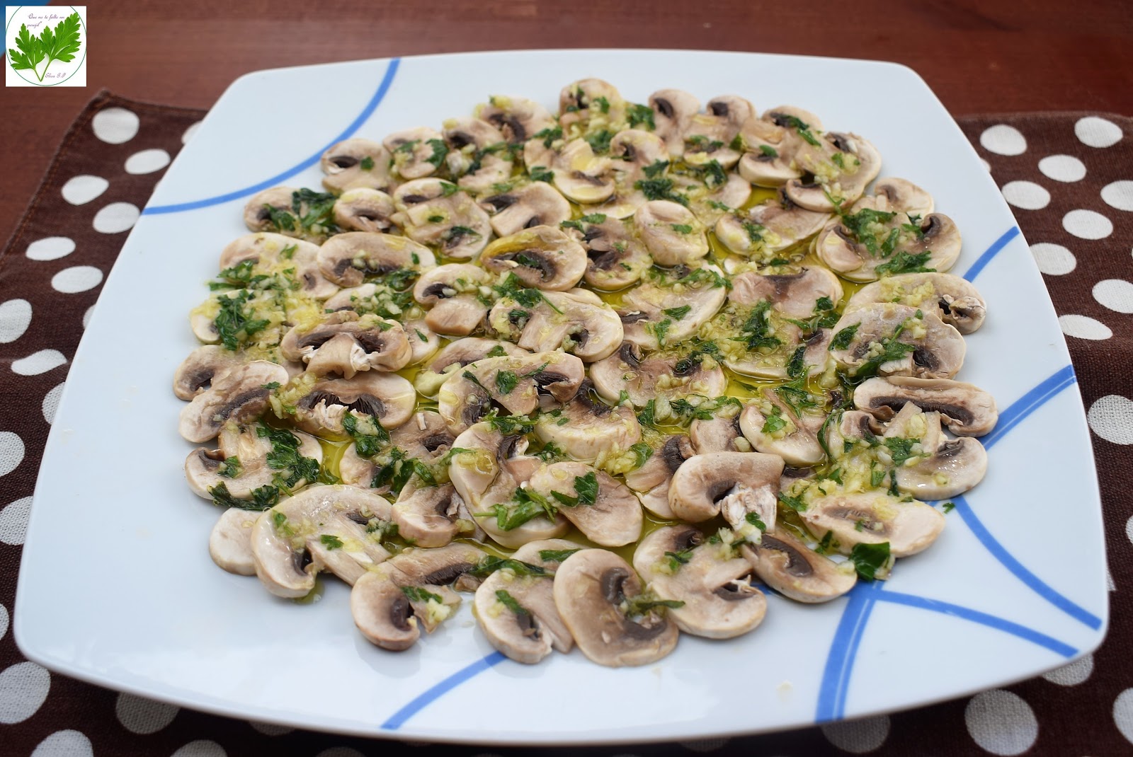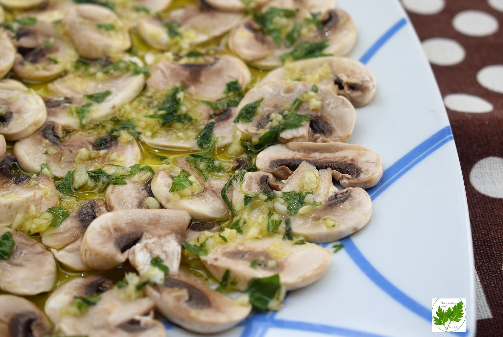 Pica muy pequeñitos los dientes de ajo y las hojas de perejil. Pon esta picada en un cuenco cubierta de aceite. Reserva.Lamina los champiñones ( puedes comprarlos ya laminados y te ahorras este paso). Ponlos en un recipiente con el vinagre y un poco de sal al gusto. Tápalo bien e introduce en el frigorífico durante 1/2 hora. Transcurrido este tiempo pásalos a un escurridor para quitar el exceso de vinagre. Disponlos en la base de un plato y rocía con la picada de ajo, perejil y aceite que teníamos reservada. Rectifica de sal si es necesario.