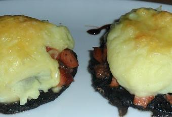 Sobre cada uno de los champiñones echamos una cucharada del preparado de carne y salchichas y por encima disponemos un poco de puré de patata. Encima le ponemos el queso rallado y metemos en el horno precalentado hasta que se gratine totalmente el queso.