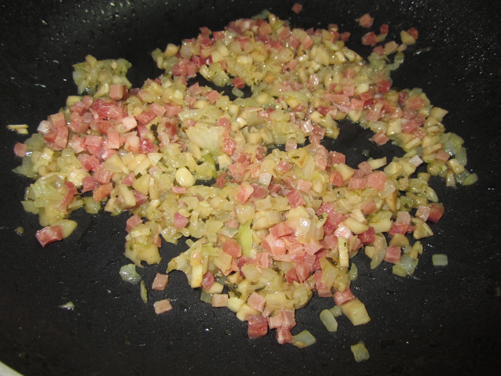 Cuando le quede poco para estar bien pochado le añadimos los taquitos de jamón para que suelten bien su sabor.