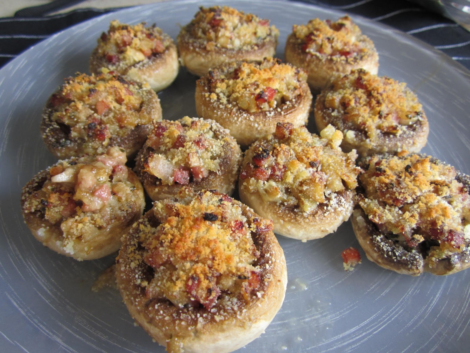 INGREDIENTES:- Champiñones grandes.- Jamón picado.- Cebolla tierna.- Pan rallado.- Queso en polvo.