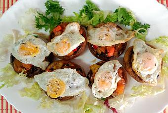 En una sartén fríe los huevos de codorniz y ponlos encima de cada champiñon.