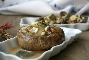 - Rellena los champiñones con la farsa anterior y pon encima trocitos de queso.