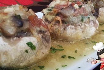 - Limpia bien los champiñones y quítales el pié. Resérvalos. - Salpimenta los sobreritos.- Pica en trocitos pequeños los pies de los champis.- Sofríe los 3 dientes de ajo laminados en un chorrito de aceite, en menú freír. Cuando comiencen a dorar, añade el jamón y los pies de los champis picaditos. Remueve todo bien.- Programa: Válvula cerrada - Menú plancha - (+)2 minutos - (T)180º - Despresuriza.- Agrega el queso rallado, el perejil picado, una pizca de sal, pimienta negra molida, el huevo y mezcla todo muy bien. Rellena los sombreros de los champiñones con esta mezcla. Resérvalos.Salsa:- Sin lavar la cubeta, sofríe los 2 ajos en láminas en un poco de aceite. Coloca la rejilla, añade la 1/2 pastilla de carne y el vasito de agua.