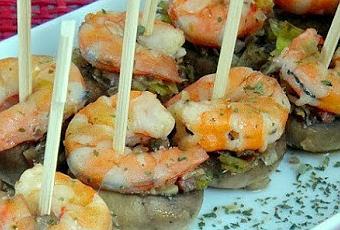 - Escurrir y rellenar los champiñones, colocar un langostino crudo pelado sobre cada uno y hornear a 180ºC unos 10´.