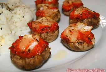 Precalentar el horno a 180º. Untar con aceite un molde de horno y colocar encima los champiñones rellenos.