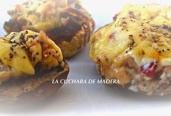Champiñones rellenos de atún:1 tomate medianoaceite de oliva extra virgen1 lata pequeña de atún natural1 lata pequeña de pimientos rojos asados lactonesaQueso gouda ralladoSal y pimienta molidaElaboración:Encendemos el horno a unos 170 grados para que se caliente, mientras, lavamos los champiñones, le quitamos la piel y separamos el tronco