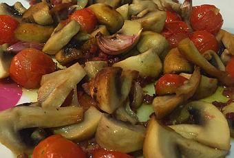 1/4 de champiñón grande12-14 tomates cherry10 dientes de ajo50 gramos de jamón cortado a daditossalaceitepimienta