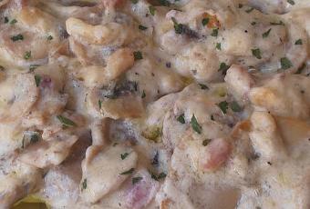 CHAMPIÑONES Y BACON EN SALSA DE QUESO Y NATA