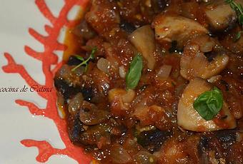 500 gr de champiñones cortados en 4cebolla muy picada al gusto de cada uno1-2 dientes de ajo muy picados3 tomates sin piel muy picadostomillo y albahacasal de hierbasun poquito de aceite de olivaPreparación: