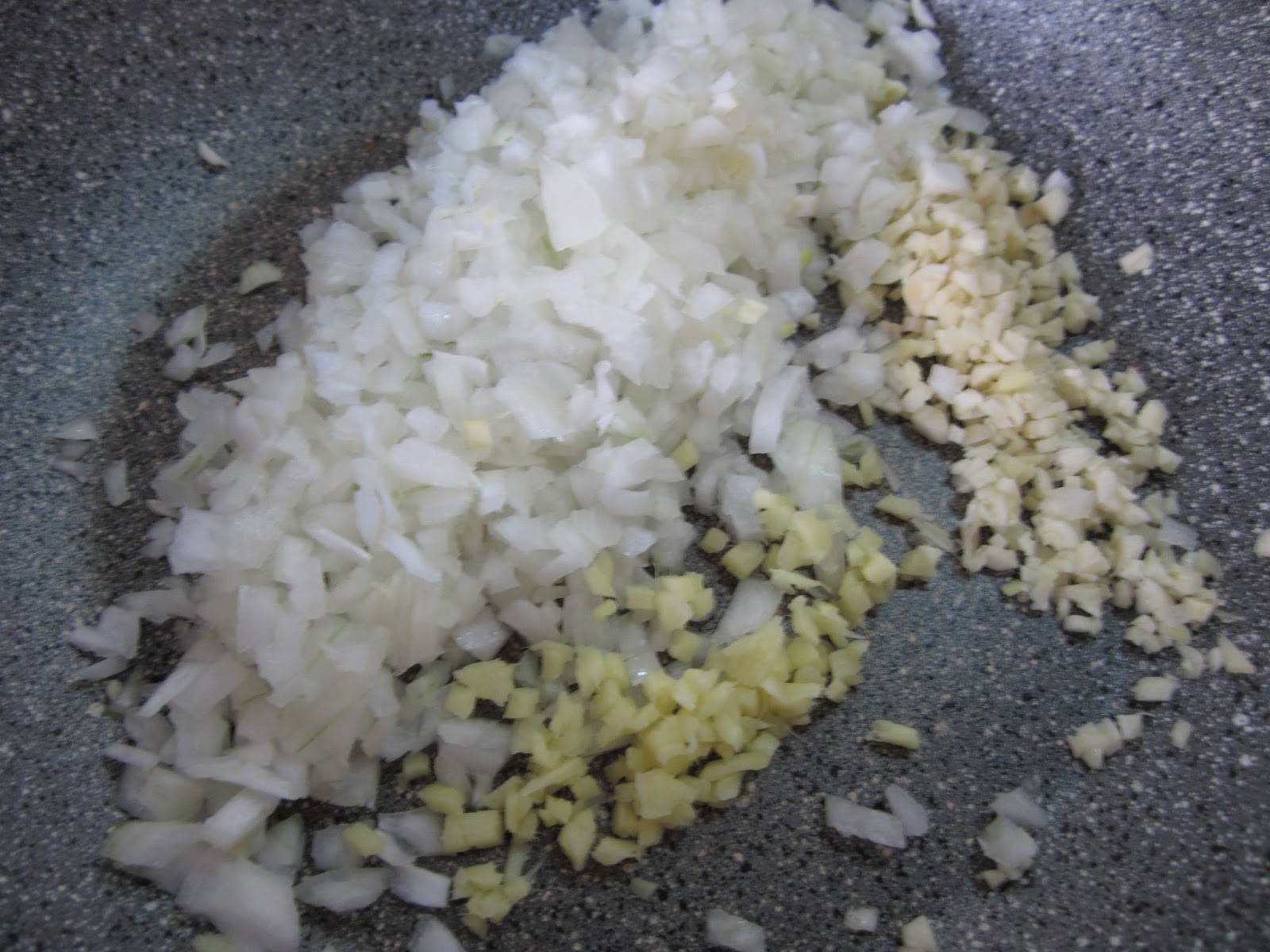 La preparación es muy sencilla lo primero que vamos a hacer es picar la cebolla y el ajo muy finito, también vamos a rallar el jengibre y lo vamos a sofreír con un par de cucharadas de aceite de oliva y una pizca de sal, a fuego lento hasta que veamos que todos se vuelve transparente.