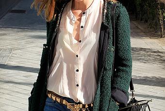 Os propongo para la mañana de Domingo un look a base de chaqueta "chanelera" extra larga y camisa tipo esmoquin con jeans, cinturón de tachas, tacones de punta y bolso de flecos para tomar el aperitivo por Madrid y disfrutar del solete.