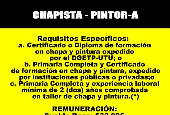 Lea con Atención !!Al Final de la Publicación Está el Acceso al Registro...Brindamos la Información Como nos Gusta Recibirla...Inscripciones 06/11/2023 hasta el 20/11/2023Requisitos Específicos:a. Certificado o Diploma de formación en chapa y pintura expedido por el DGETP-UTU; ob. Primaria Completa y Certificado de formación en chapa y pintura, expedido por instituciones públicas o privadas;oc. Primaria Completa y experiencia laboral mínima de 2 (dos) años comprobada en taller de chapa y pintura.(*)