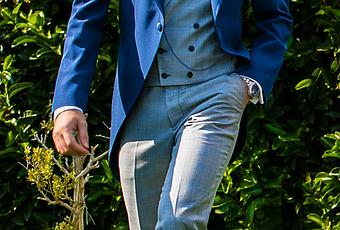 MODELO: 1704 OTTAVIO NUCCIO GALAChaqué italiano azul royal con solapa de pico, vivos de raso y un botón en tejido mixto lana con pantalón príncipe de gales. Traje de novio 1704 Colección Gentleman Ottavio Nuccio Gala.