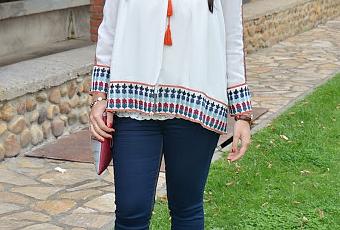 Es una prenda ligera, me encanta con sus bordados y flecos y una mezcla de colores muy delicada y elegante, por ello lo combiné con vaqueros y zapatos negros, algo sencillo que no le restara protagonismo.