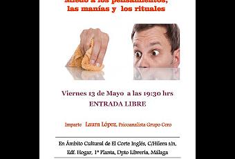 Todos alguna vez nos hemos reconocido como un poco maniáticos en algunos momentos puntuales, un hacer concreto que repetimos sin una explicación lógica o una idea fija que nos asalta sin poder llegar a controlarla y que se nos impone, donde en los casos más extremos, pueden impedir incluso la cotidianidad. “El hombre no teme más que a sus propias palabras”, porque somos sujetos habitados en el lenguaje y hay palabras y pensamientos que a veces nos asaltan y nos desvelan un otro de nosotros mismos que miramos con extrañeza, que no reconocemos. Es algo que no se puede razonar, porque en realidad la persona sabe que son absurdos, pero que le hacen sentir en muchos de los casos, como si estuviera perdiendo la cordura. A veces se convierte en un auténtico drama donde se impide trabajar, relacionarse con otras personas, sobrellevar el día a día...El psicoanálisis nos desvela lo inconsciente, que nos dice de esa realidad y de los mecanismos de nuestro aparato psíquico, de cómo respondemos ante lo que nos rodea y sobre todo, ante nuestros propios deseos, que por ser c inconscientes no se sabe de ellos, es un saber no sabido, pero que se refleja en los síntomas, en los lapsus, los olvidos...que son las manifestaciones del inconsciente. Manías, rituales, pensamientos que se imponen ¿hasta qué punto pueden considerarse“normales”? ¿Tienen un sentido propio? ¿Cómo podemos librarnos de ellos? ¿Qué se oculta tras ese miedo? ¿Es un miedo real?Una charla coloquio imprescindible para entender y resolver qué habla más allá de mi conciencia a través de actos y pensamientos incomprensibles.Imparte Laura López, Psicoanalista Grupo CeroLugar: Ámbito Cultural de El Corte Inglés. C/Hilera s/n. Málaga. Edf. Hogar, Planta Baja, Dpto de Librería, Viernes 13 de Mayo a las 19:30 hrs