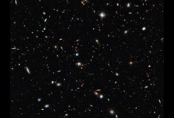 Vista transversal del Universo. La mayoría de las galaxias visibles aquí pertenecen a un cúmulo a 5.000 millones de años-luz de distancia. Crédito: NASA, ESA.