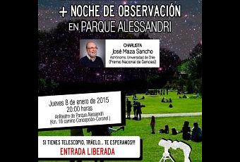 Uno de los eventos en que se espera una gran convocatoria, es la próxima Charla de Astronomía del Premio Nacional de Ciencias José Maza en el Parque Alessandri. El astrónomo de la Universidad de Chile se presentará el día jueves 8 de enero en el anfiteatro del Parque donde ofrecerá una charla gratuita a todo el público asistente. Tras la charla, todos los amantes de las estrellas podrán vivir una noche de observación junto al equipo del Observatorio UdeC, que tendrá dispuestos los telescopios del Departamento de Astronomía y que estará asesorando a asistentes que lleguen con sus propios telescopios.