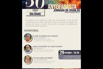 La iniciativa comenzará con una jornada de ponencias tituladas “50 años del Big Bang”, que busca conmemorar que en 1964 los científicos Arno Penzias y Robert Wilson encontraron lo que sería la primera evidencia del Big Bang, la radiación de Fondo Cósmico. Las charlas se realizarán entre 10:30 a 12:30 horas en el auditorio del Liceo Experimental Artístico de Antofagasta (Coquimbo 827) y está dirigida a estudiantes de enseñanza media y profesores.