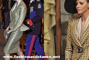 La prometida del Príncipe Alberto lucía un look impecable con un traje de chaqueta entallada y falda en color beis dorado con topos grises y blusa de raso a juego, de Armani Privé, Otoño/Invierno, 2010-2011, que combinó con zapatos de salón en color grafito, unos originales guantes muy cortos y un pequeño clutch. Charlene causó sensación con su elegante sombrero que le favorecía mucho. Look ganador!
