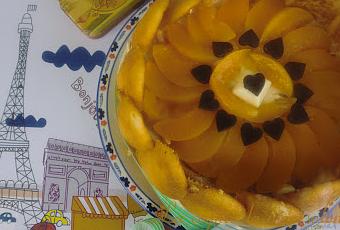 Cuando la tarta está bien fria, la desmoldamos y decoramos con láminas de melocotón y algún adorno de chocolate.