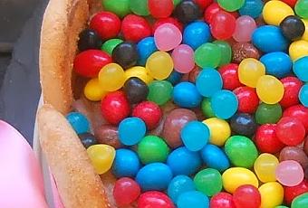 Ahora sólo nos quedará cubrir la mousse con lacasitos, conguitos o caramelitos de colores, quitar el aro del molde y ponerle un lazo alrededor, no tengáis miedo porque si lo habéis dejado reposar lo suficiente no se os desmontará el pastel.