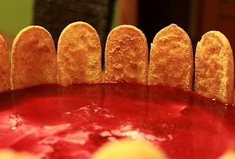 En un molde de paredes desmontables, ponemos todo el fondo con los bizcochitos, bañamos con la mitad del almíbar de frambuesa, colocamos la mitad de la mousse, cubrimos de nuevo con bizcochitos y volvemos a bañar con almíbar, y de nuevo vertemos el resto de la mousse. Extendemos bien con espátula y colocamos en el frigorífico un mínimo de 3 horas.