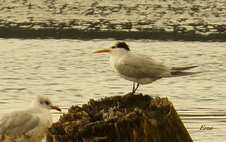 Un precioso charrán bengalí (3ª cita para Cantabria) que descansaba en un tocón rodeado de pequeñas gaviotas y otros charranes más comunes junto a Montehano.