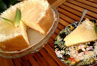 En un bol, mezclar el queso ricotta, el mascarpone y la maicena. Añadir luego la leche condensada, los huevos, la crema de coco y la piña. Mezclar todo y verter en el molde. Hornear 15 minutos a 180º y luego 100 minutos a 120º. Sacar del horno y verter por encima la leche condensada mezclada con la nata y seguir horneando 15 minutos más a 120º. Dejar que se enfríe por completo, retirar el aro del molde y dejar en la nevera toda la noche. Al día siguiente, decorar con unas hojas de piña y coco rallado antes de servir.