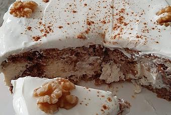 Mezclar todos los ingredientes en un bol con unas varillas para que quede todo bien mezclado y aplicar sobre la tarta desmoldada, ya sobre el plato de presentación. Decorar por encima con una medias nueces y un poco de canela espolvoreada.