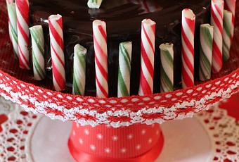 Dejamos reposar para que el chocolate se solidifique un poco. Cortamos los bastones de caramelo y los colocamos alrededor del pastel. Adornamos la parte superior con dos bastones de caramelo cruzados.