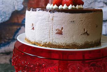 Vertemos un tercio de la mezcla sobre la base, agregamos unas fresas cortadas en dados, volvemos a verte mezcla y así hasta terminar. Metemos en el frigo que cuaje durante unas 6 horas o de undia para otro.