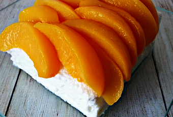 - Cuando esté medio cuajado lo decoramos con el melocotón en almíbar que habremos partido en laminas.