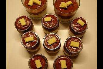 9° Sacamos los vasitos de la nevera y repartimos la mousse de chocolate sobre la mezcla de nata y queso, hasta llegar al borde del vasito.