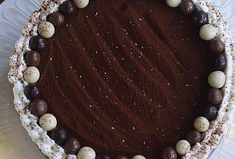 12. Finalmente, para la decoración, montamos la nata con el azúcar glass tamizado, la ponemos en una manga pastelera con una boquilla rizada y hacemos la decoración del filo de la tarta. Espolvoreamos cacao en polvo y decoramos con las bolitas de chocolate.
